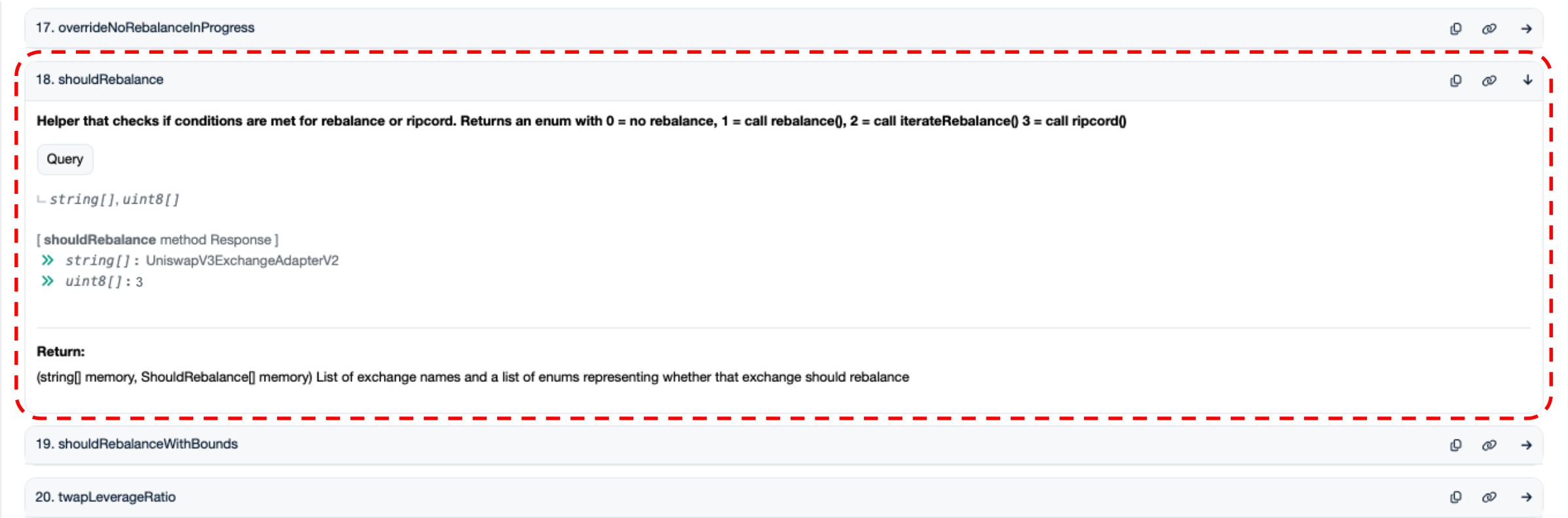 After selecting the appropriate contract, navigate to the *Contract > Read Contract* tab. Select the `shouldRebalance` function and click *Query*. In the extremely unlikely event that Ripcord can be called as a result of an exceptionally high leverage ratio, this function will return: